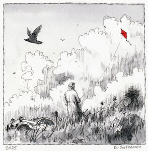 2025Een persoon in een veld houdt een rode vlieger vast, terwijl een vogel boven de wolken vliegt.
